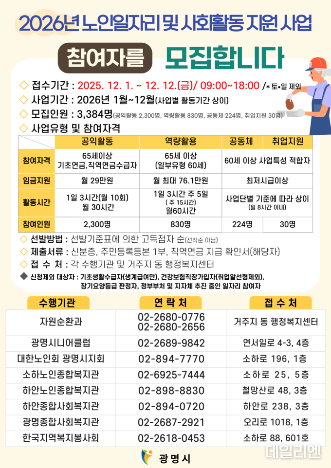 광명시는 오는 12월 1일부터 12일까지 '2026년 노인일자리 및 사회활동 지원사업' 참여자 3384명을 모집한다. 이를 위해 시는 전년 대비 1억 7,400만 원이 증액된 총 162억 원의 예산을 편성했다.