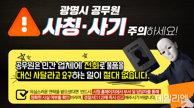 [데일리엔뉴스 이종성 기자] 광명시가 최근 공무원 사칭 사기 피해가 잇따르자 지역 소상공인과 자영업자들에게 긴급 주의를 당부했다.