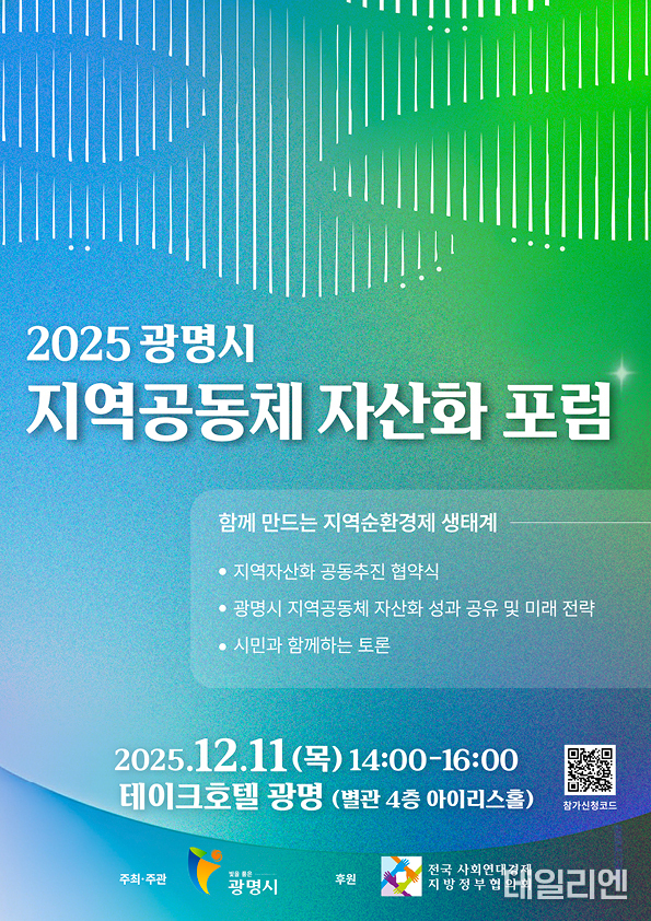 [데일리엔뉴스 이종성 기자] 광명시가 지역 내부에서 경제가 순환하는 구조를 강화하기 위해 공동체 자산화 정책을 공개하고 본격적인 실행 논의에 들어간다. 시는 11일 테이크호텔 광명에서 ‘지역순환경제 생태계 조성’을 주제로 대규모 정책 포럼을 개최한다.