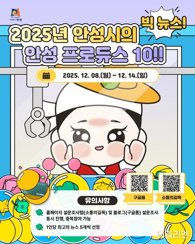 [데일리엔뉴스 이승준 기자] 안성시가 8일부터 14일까지 ‘2025년을 빛낸 안성시 10대 뉴스’ 선정을 위한 시민 참여 투표를 진행한다.
