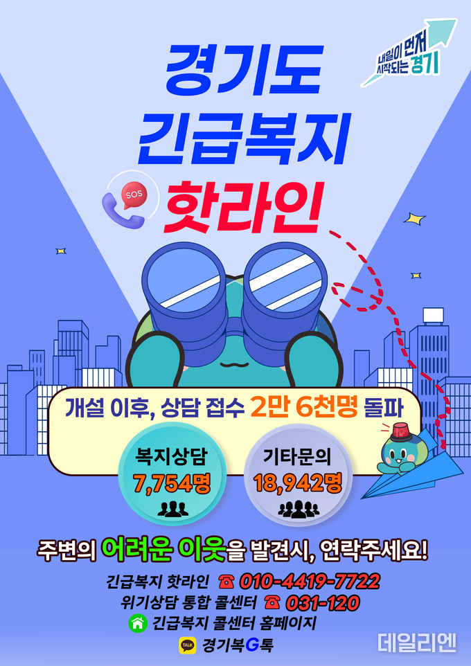 [데일리엔뉴스 이종성 기자] 경기도가 운영 중인 ‘긴급복지 핫라인’이 개설 3년 3개월 만에 상담 접수 인원 2만6천 명을 넘어섰다. 위기 가구를 조기에 발굴하고 지원을 연계하는 창구로 자리 잡았다는 평가다.