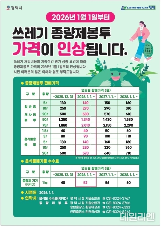 [데일리엔뉴스 이승준 기자] 평택시가 2026년 1월 1일부터 쓰레기 종량제봉투 가격을 3년간 단계적으로 인상한다.