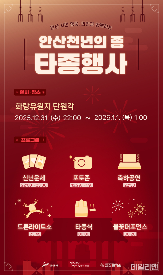 안산시는 31일 오후 10시부터 화랑유원지 단원각에서 ‘2026 안산 천년의 종 타종 행사’를 개최한다고 밝혔다. 이번 행사는 한 해를 마무리하고 새해의 출발을 시민과 함께 나누기 위해 마련됐다.