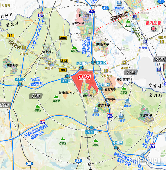 지구는 봉담읍 상리·수영리·내리, 매송면 천천리·원평리 일원 228만9715㎡ 부지에 조성된다. 예정 지적 측량 결과를 반영해 면적이 기존보다 3797㎡ 증가했다.