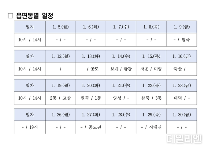 행사는 9일 일죽면을 시작으로 23일 대덕면까지 순차적으로 이어지며, 직장인 참여 확대를 위해 27일과 29일에는 공도권 및 시내권 주민을 대상으로 한 야간 정책공감토크도 별도로 진행된다.