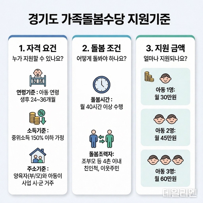 [데일리엔뉴스 이종성 기자] 경기도가 2026년부터 가족돌봄수당 사업 대상을 지난해 14개 시군에서 26개 시군으로 확대 시행한다. 이에 따라 더 많은 도민 가정이 월 최대 60만 원의 지원 혜택을 받을 수 있게 됐다.