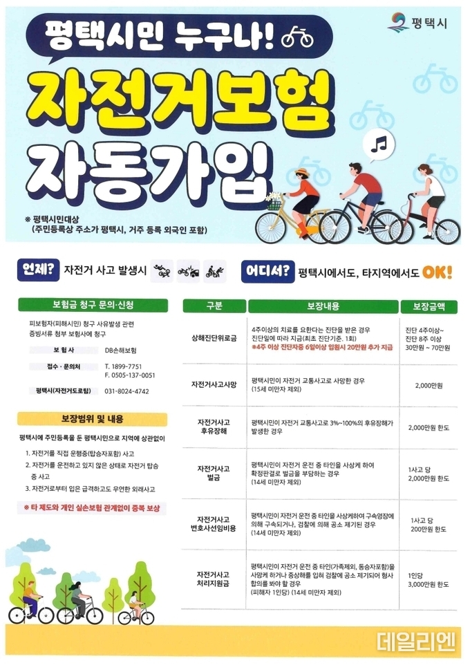 이번 자전거 보험은 별도 가입 절차 없이 평택시에 주민등록이 되어 있는 시민이라면 누구나 자동으로 보장 대상이 된다.