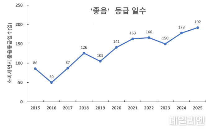 ‘좋음’ 등급 기준인 15㎍/㎥ 이하 일수는 31개 시군 111개 도시대기측정소 평균 192일로, 종전 최고치였던 2024년(178일)보다 14일 늘었다.