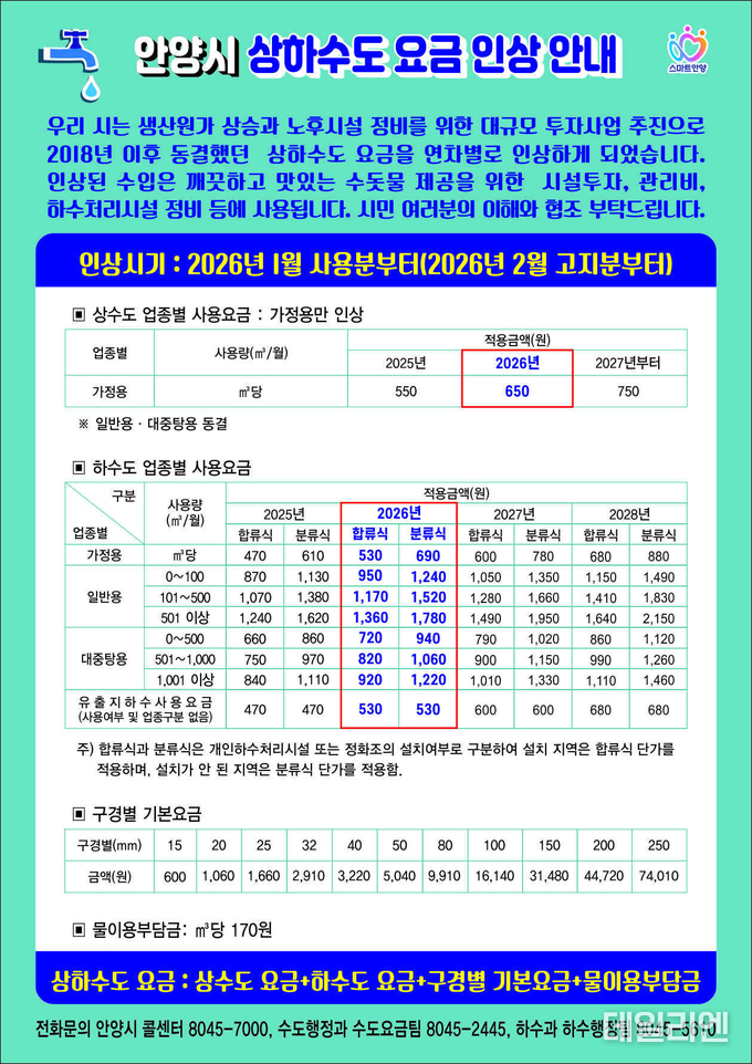 [데일리엔뉴스 이종성 기자] 안양시가 오는 2026년 2월 고지분부터 상하수도 요금을 인상한다. 인상 배경은 상하수도 생산원가 상승과 노후 시설 정비를 위한 대규모 투자 재원 확보다.