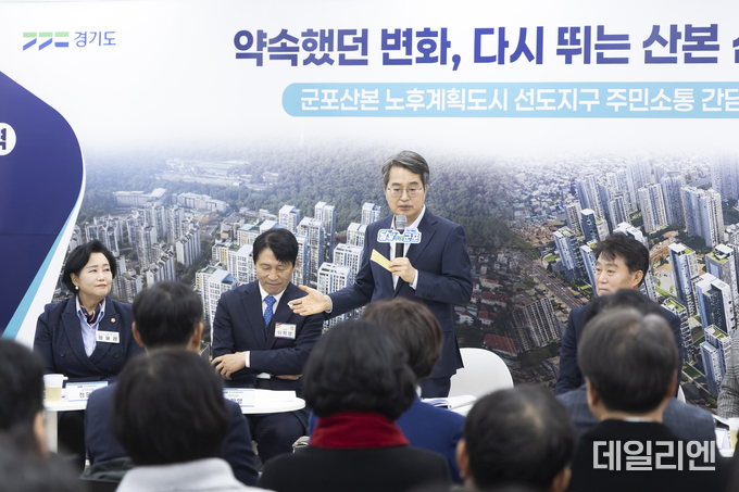 김 지사는 이날 군포보훈회관에서 열린 ‘군포산본 노후계획도시 선도지구 주민소통 간담회’에 참석해 “15개 선도지구 중 군포 산본이 가장 모범적인 사례가 되도록 하겠다”며 “특별법 통과로 일반 재건축·재개발보다 사업기간이 6년 정도로 단축될 수 있게 됐다”고 밝혔다.