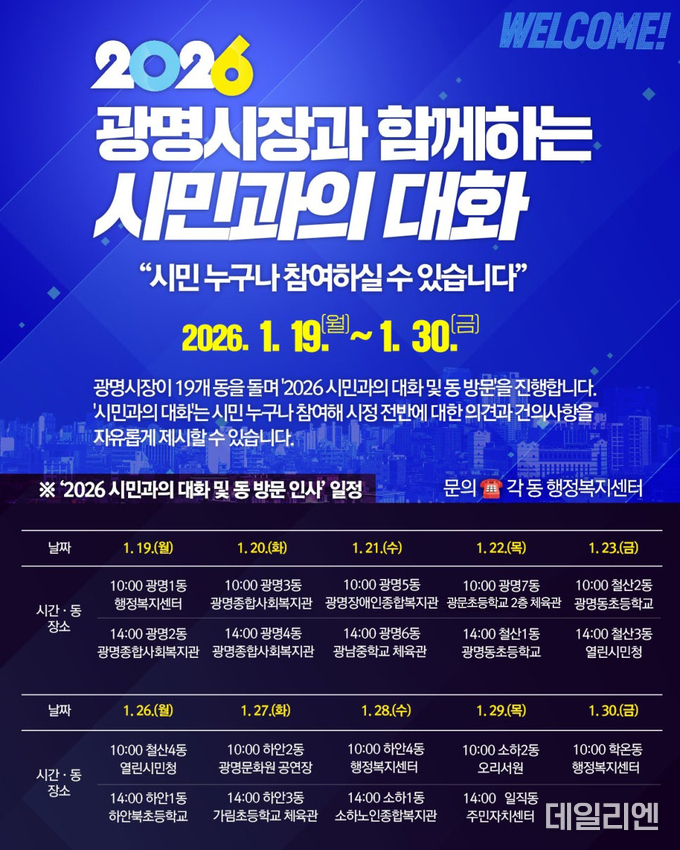 이번 시민과의 대화는 ▲19일 광명1~2동을 시작으로 ▲20일 광명3~4동 ▲21일 광명5~6동 ▲22일 광명7동·철산1동 ▲23일 철산2~3동 ▲26일 철산4동·하안1동 ▲27일 하안2~3동 ▲28일 하안4동·소하1동 ▲29일 소하2동·일직동 ▲30일 학온동 순으로 이어진다.