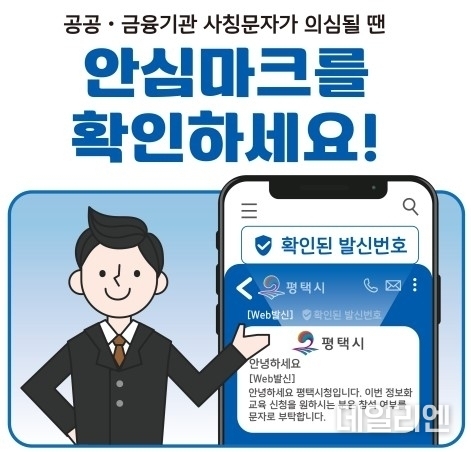 [데일리엔뉴스 이승준 기자] 평택시가 1월 16일부터 문자결제사기(스미싱) 예방을 위한 ‘안심문자서비스(RCS)’를 도입해 운영에 들어갔다. 시민이 안심하고 행정안내 문자를 확인할 수 있도록 시 로고와 인증 마크를 함께 표기하는 방식이다.