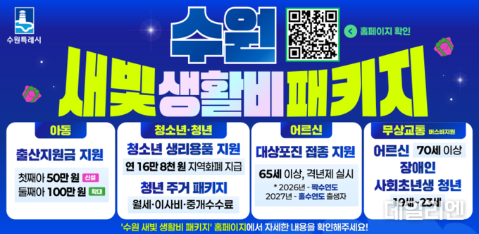 [데일리엔뉴스 이종성 기자] 수원시가 2026년부터 본격 시행에 들어간 ‘새빛 생활비 패키지’가 시민 생활 전반을 바꾸는 체감형 정책으로 주목받고 있다. 출산, 교통, 주거, 의료, 생필품까지 생활비 부담을 직접 줄이는 7개 지원 사업을 하나의 묶음으로 설계한 것이 특징이다.