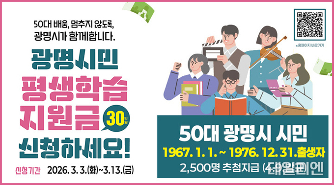 [데일리엔뉴스 이종성 기자] 광명시는 50대 시민의 학습 기회를 확대하기 위해 ‘2026년 광명시민 평생학습지원금’ 신청을 오는 3월 3일부터 13일까지 받는다고 26일 밝혔다.