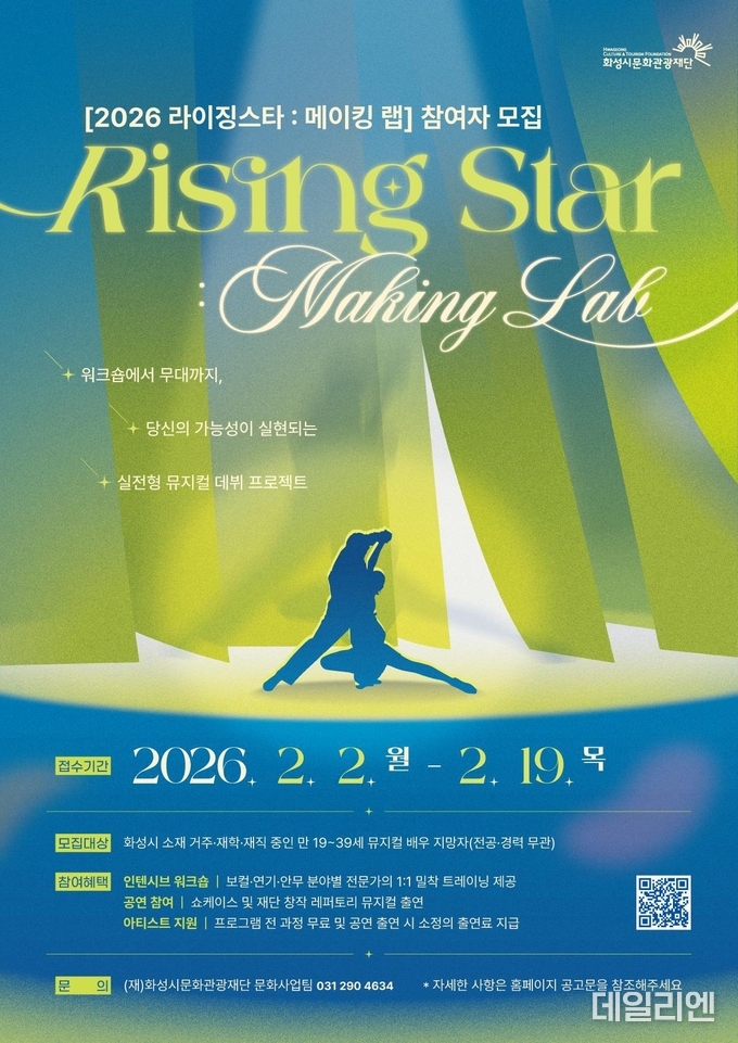 [데일리엔뉴스 이종성 기자] 화성시문화관광재단은 뮤지컬 분야 신진 인재를 발굴·육성하기 위한 ‘2026 라이징스타: 메이킹 랩’ 오디션 참가자를 오는 2월 2일부터 19일까지 모집한다고 26일 밝혔다.