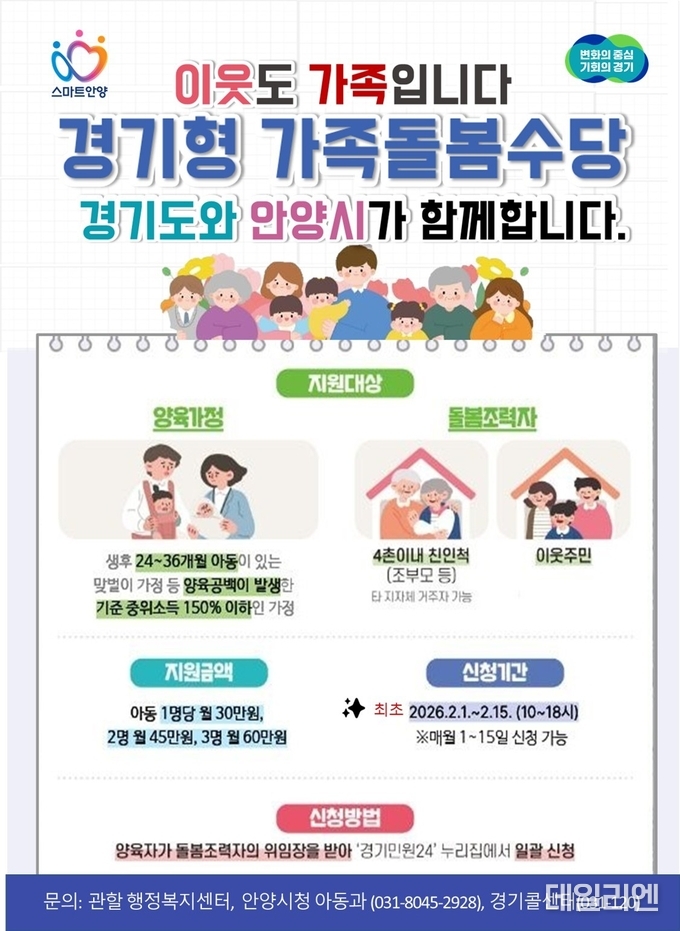 [데일리엔뉴스 이종성 기자] 안양시가 돌봄 사각지대 해소를 위해 가족과 이웃에게 수당을 지급하는 ‘경기형 가족돌봄수당’ 신청을 2월 1일부터 받는다.