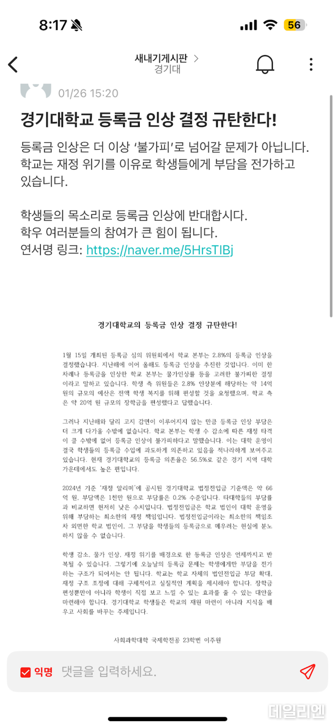 [데일리엔뉴스 이종성 기자] 경기대학교의 등록금 인상 결정에 반발하는 학생들의 문제 제기가 이어지고 있다. 등록금 인상 부담이 학생들에게 일방적으로 전가되고 있다는 지적과 함께 학교 법인의 책임 있는 재원 부담 확대를 요구하는 목소리가 커지고 있다.