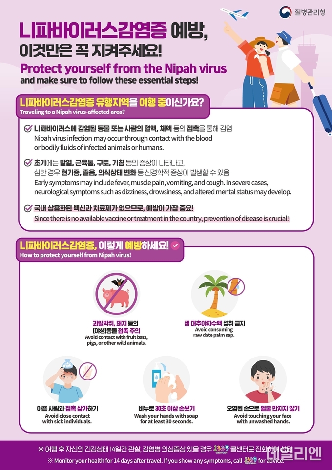 [데일리엔뉴스 이종성 기자] 설 연휴를 맞아 해외여행이 늘어나는 가운데 니파바이러스 발생이 보고된 국가를 방문할 경우 각별한 주의가 필요하다는 당부가 나왔다.