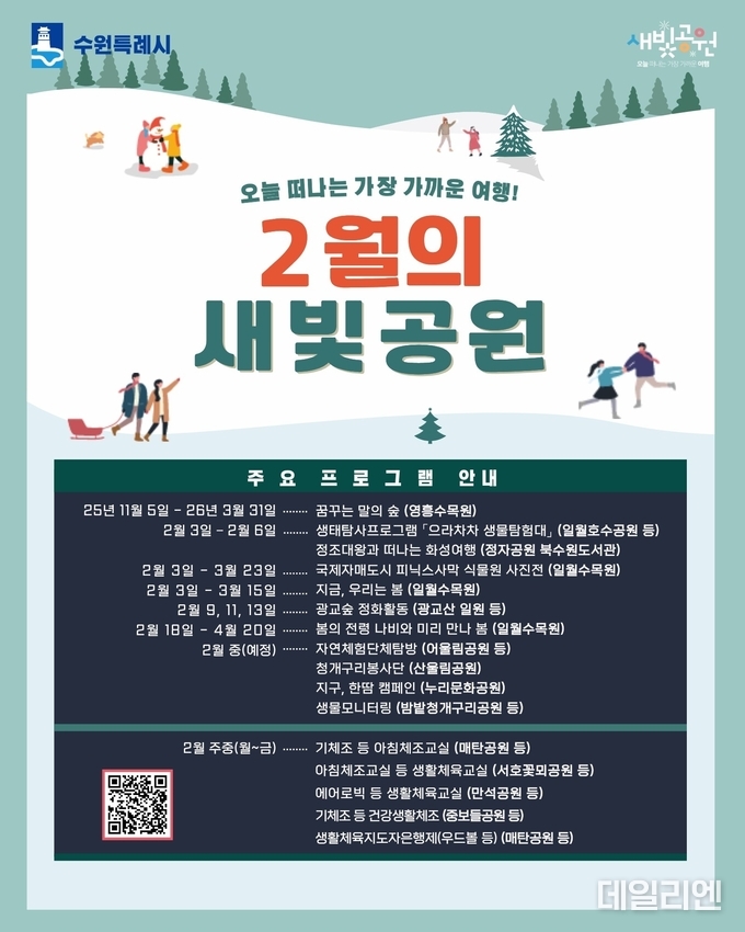 [데일리엔뉴스 이종성 기자] 수원특례시가 2월 한 달 동안 시내 주요 공원에서 생태·환경·생활체육 등 시민 참여형 프로그램을 운영한다고 4일 밝혔다.