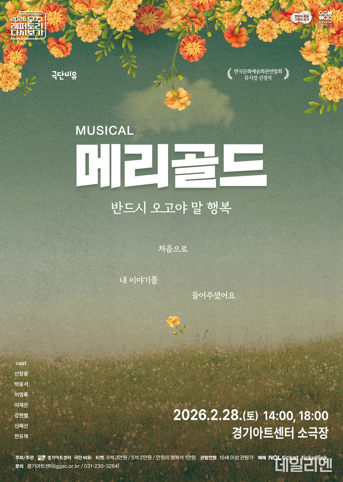할인 대상 공연은 28일 오후 2시와 6시 경기아트센터 소극장에서 열리는 뮤지컬 ‘메리골드’다. 좌석은 R석(3만 원), S석(2만 원), 만원의 행복석(1만 원)으로 구성되며, 이번 프로모션은 R석에 한해 적용된다.