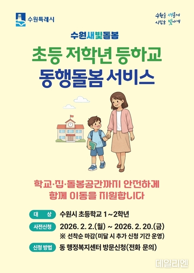 [데일리엔뉴스 이종성 기자] 수원특례시는 초등학교 1~2학년 자녀를 둔 가정을 대상으로 ‘초등 저학년 등하교 동행돌봄 서비스’ 사전 신청을 받는다고 11일 밝혔다.