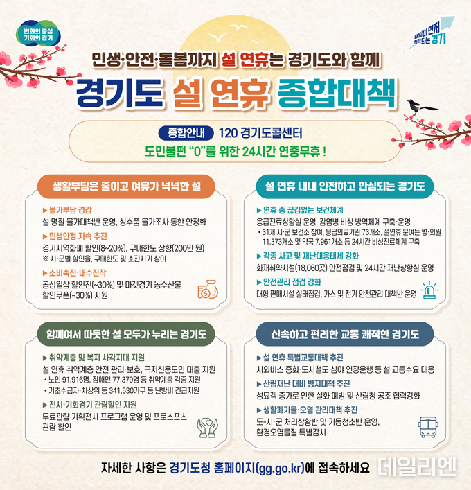 [데일리엔뉴스 이종성 기자] 경기도는 설 연휴를 맞아 도민 불편을 최소화하기 위해 민생·안전·복지·교통 전반을 아우르는 ‘설 연휴 종합대책’을 추진한다고 11일 밝혔다.