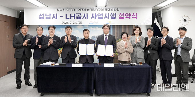 성남시(시장 신상진)는 24일 오전 시청 제1회의실에서 한국토지주택공사(LH)와 ‘성남시 2030-2단계 상대원3 재개발’ 사업시행협약을 체결했다. 협약식에는 신상진 성남시장과 박현근 LH 수도권특별본부장 등 관계자들이 참석했다.