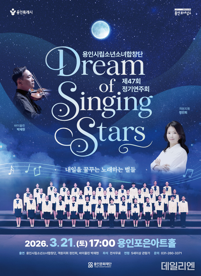 [데일리엔뉴스 이종성 기자] 용인문화재단이 3월 21일 용인포은아트홀에서 용인시립소년소녀합창단 제47회 정기연주회 ‘Dream of Singing Stars’를 개최한다.