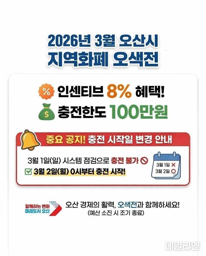 이권재 오산시장은 “금융기관 시스템 점검으로 3월 1일 하루 동안 충전 서비스가 제한된다”며 “시민과 지역 상권에 도움이 되는 방향으로 안정적인 운영을 이어가겠다”고 말했다.