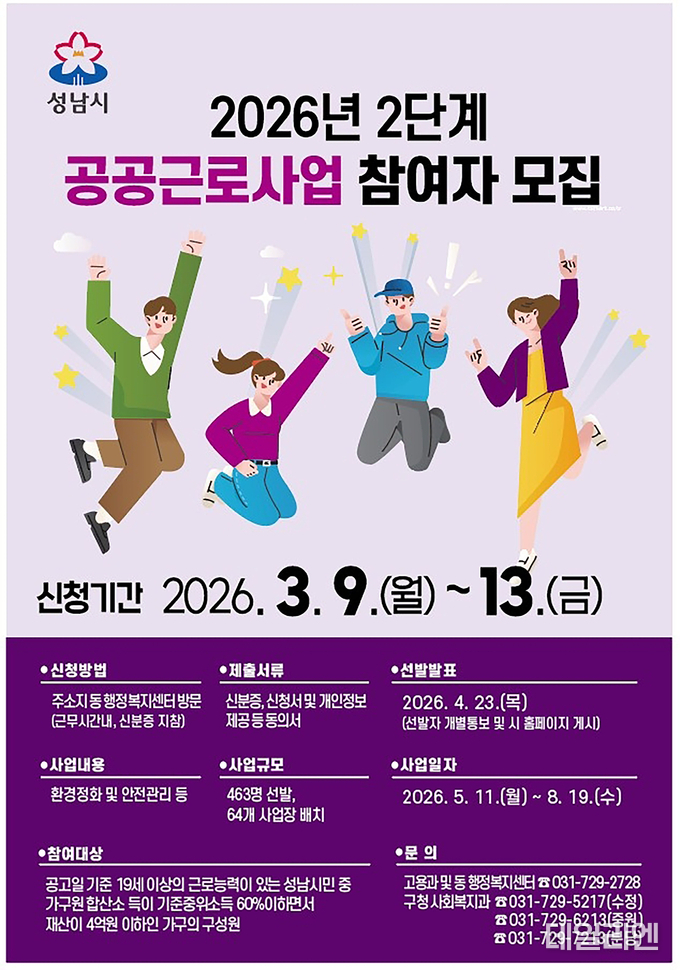 [데일리엔뉴스 이종성 기자] 성남시가 올해 2단계 공공근로사업 참여자 463명을 공개 모집한다.