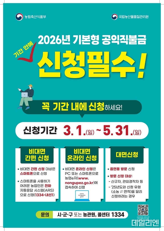 비대면 간편 신청 대상은 지난해 공익직불금 등록정보와 올해 농업경영체 등록 정보에 변동이 없는 농업인이다. 해당 대상자에게는 농림축산식품부가 스마트폰 문자로 신청 안내를 제공할 예정이다.