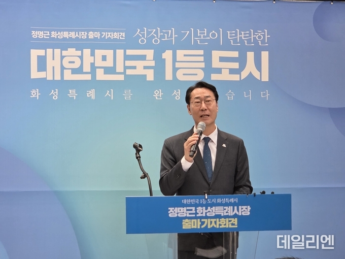 [데일리엔뉴스 이종성 기자] 정명근 화성특례시장이 18일 나래울종합사회복지관 로비에서 기자회견을 열고 민선 9기 화성특례시장 선거 출마를 공식 선언했다.