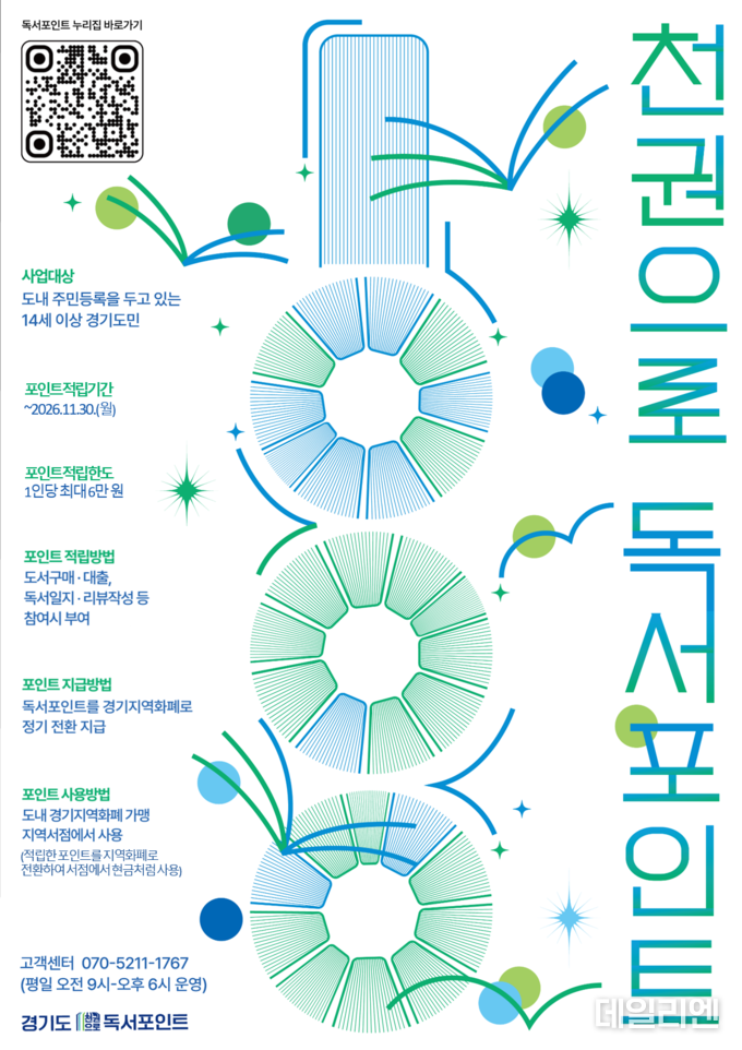 윤명희 경기도서관장은 “책을 읽는 경험이 생활 속 혜택으로 이어질 수 있도록 경기도 대표 독서문화 프로젝트인 ‘천권으로’와 연계해 독서포인트 사업을 설계했다”며 “경기도민이 책과 함께하는 평생 독서의 길에 자연스럽게 참여하길 바란다”고 말했다.