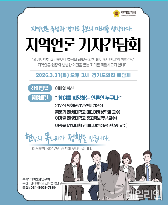 경기도의회는 2026년 3월 31일 오후 3시 경기도의회 예담채에서 ‘지역언론 기자간담회’를 개최한다. 행사에는 지역언론 관계자들이 참여해 경기도 광고홍보 집행과 지역언론 관련 현안을 두고 의견을 나누게 된다.