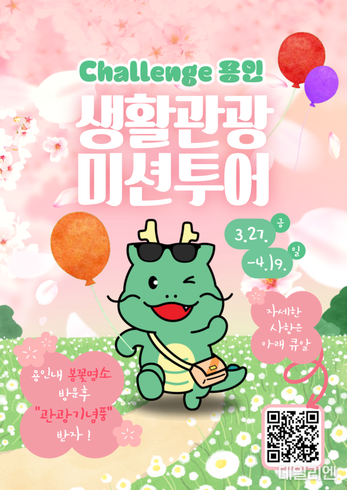 [데일리엔뉴스 이승준 기자] 용인특례시가 지역 내 봄꽃 명소를 찾는 시민과 방문객을 위한 생활관광 이벤트를 연다. 지정된 관광지에서 봄꽃 배경 사진을 인증하면 시 캐릭터 ‘조아용’을 지급하고, 누적 수량에 따라 기념품도 제공한다.