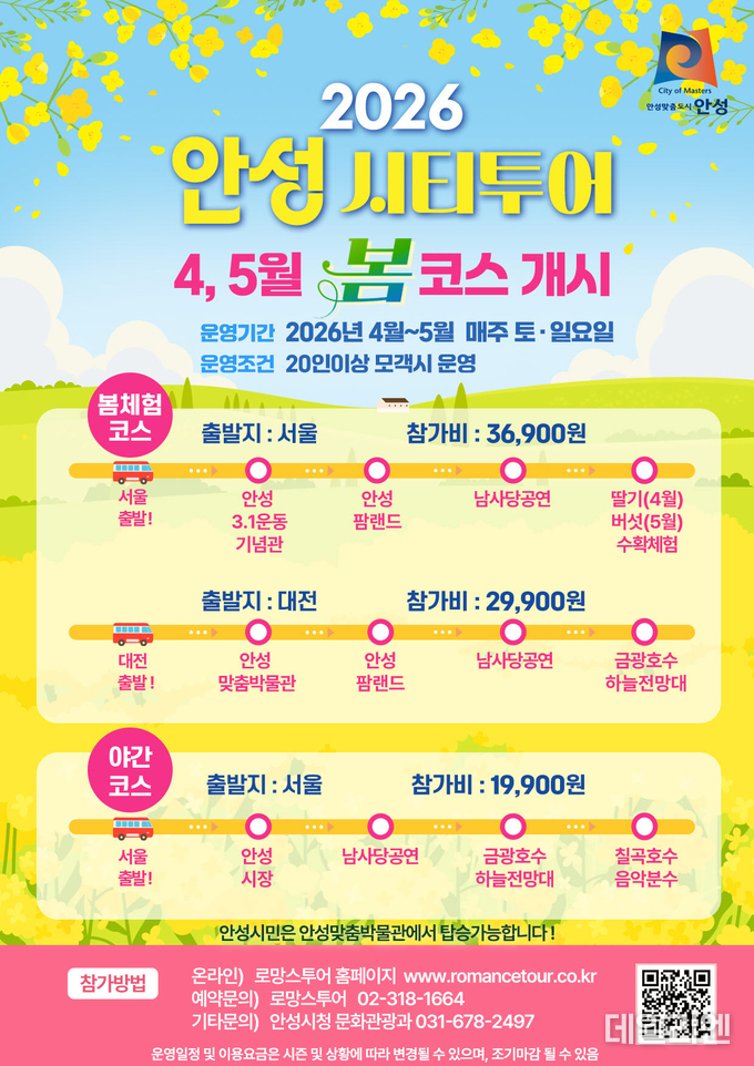 [데일리엔뉴스 이종성 기자] 안성시가 봄철 관광 수요에 맞춰 4월부터 5월까지 ‘2026 안성 시티투어 봄 코스’를 운영한다.