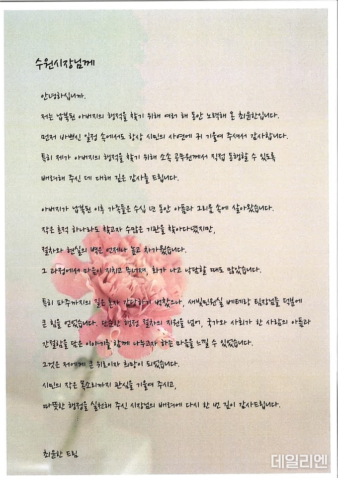 최윤한씨는 이재준 수원특례시장에게 보낸 편지에서 “아버지가 납북된 뒤 가족들은 수십 년 동안 가슴 아파하며 그리워했다”며 “파주까지 가는 길이 혼자 감당하기 벅찼지만 베테랑팀장들이 함께해 큰 힘을 얻었다”고 밝혔다.