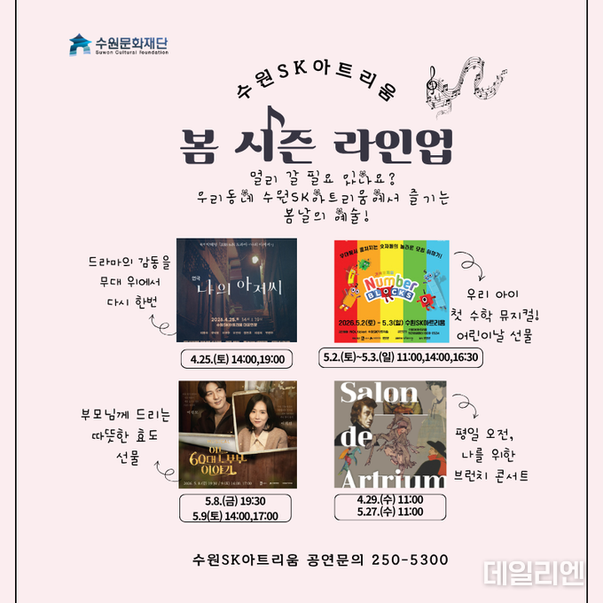 수원SK아트리움 관계자는 “공연장을 찾아 예술과 함께하는 특별한 봄나들이를 즐길 수 있도록 다양한 공연을 마련했다”며 “4편의 공연을 통해 힐링과 치유의 시간을 누리길 바란다”고 말했다.