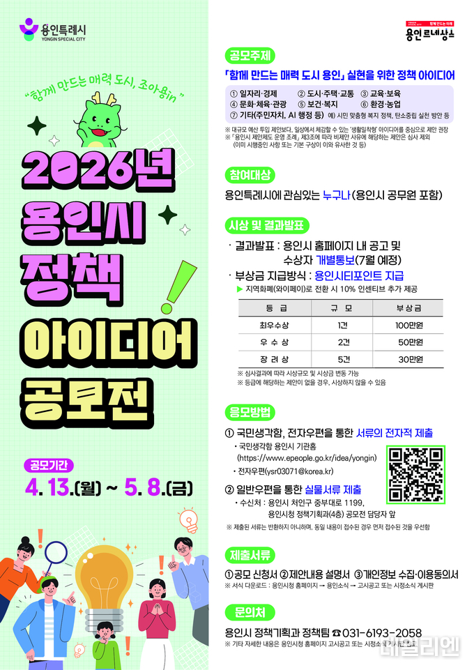 [데일리엔뉴스 이승준 기자] 용인특례시가 시민과 국민의 제안을 시정에 반영하기 위해 ‘2026년 용인시 정책 아이디어 공모전’을 열고 다음 달 8일까지 아이디어를 받는다.