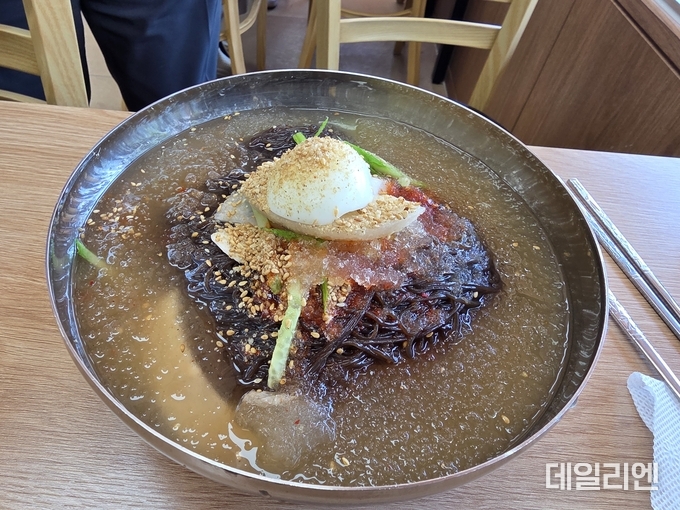 차갑게 식힌 육수 위에 면을 담고 계란과 배, 오이, 양념을 단정하게 올린 모습이 먼저 시선을 끈다.