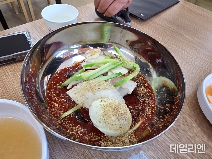 붉은 양념장이 넉넉하게 올라가고, 참깨와 오이, 배, 계란이 함께 얹힌다. 보통맛과 매운맛 가운데 고를 수 있다.