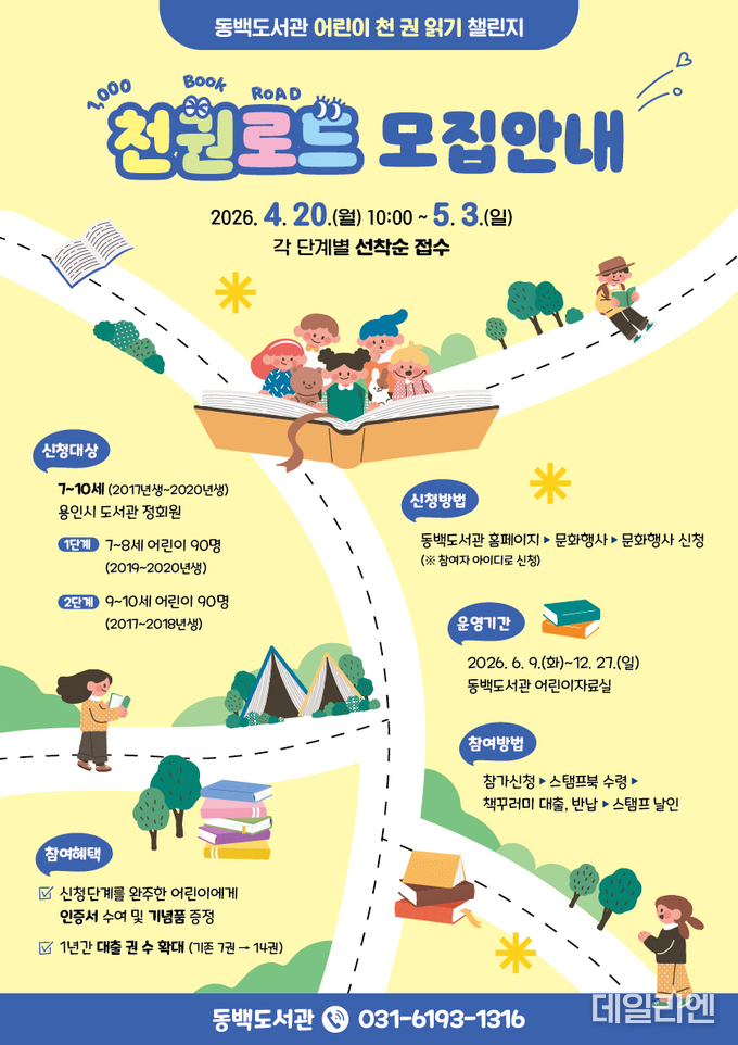 용인특례시 동백도서관은 어린이 독서 프로그램 ‘천권로드(ROAD)’ 참여 신청을 20일 오전 10시부터 받는다.