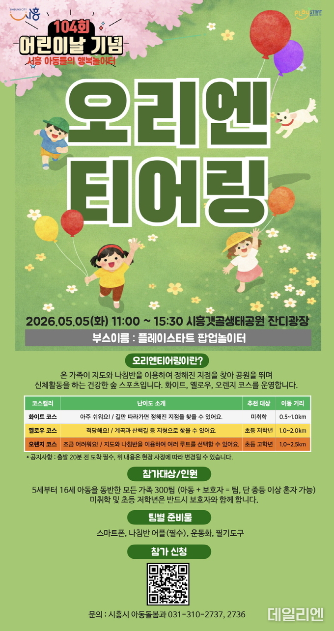 시는 제104회 어린이날 기념행사의 하나로 갯골생태공원 잔디광장에서 ‘5월 플레이스타트 팝업놀이터’를 운영한다. 행사 시간은 이날 오전 11시부터 오후 3시 30분까지다.