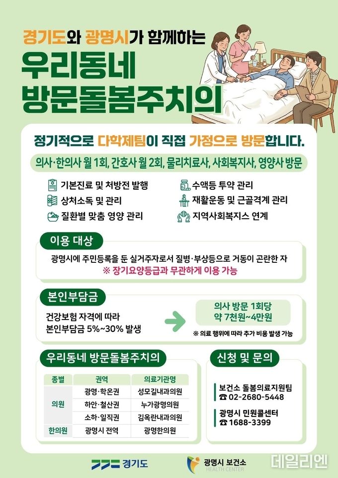 ‘우리동네 방문돌봄주치의 사업’은 2026년 12월까지 운영된다. 신청은 4월 20일부터 광명시 보건소 돌봄의료지원팀을 방문하거나 전화로 하면 된다. 자세한 사항은 광명시 보건소 돌봄의료지원팀, 광명시 민원콜센터, 각 동 행정복지센터에서 안내한다.