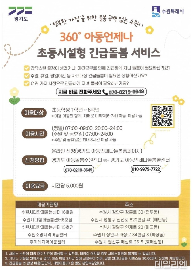 신청은 경기도 아동언제나돌봄 홈페이지 또는 경기도아동돌봄수원센터 전화 접수로 가능하다. 이용요금은 시간당 5천원이다.