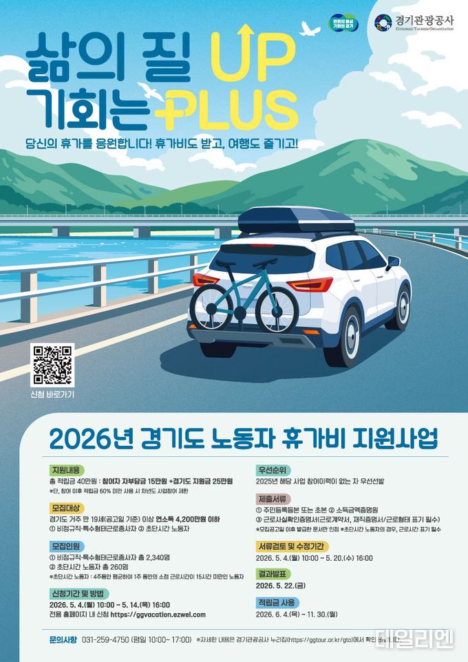 경기도는 경제적 부담으로 휴식을 미루기 쉬운 취약노동자의 휴가를 지원하는 ‘2026년 취약노동자 휴가비 지원사업’을 추진하고, 오는 5월 4일부터 14일까지 신청을 받는다고 22일 밝혔다.