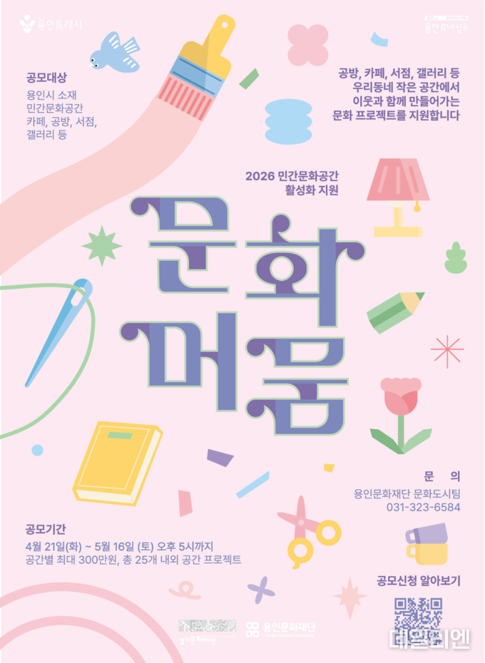 [데일리엔뉴스 이종성 기자] 용인문화재단이 지역 민간문화공간을 생활문화 거점으로 키우는 ‘문화머뭄’ 사업 참여 공간 모집에 나섰다.