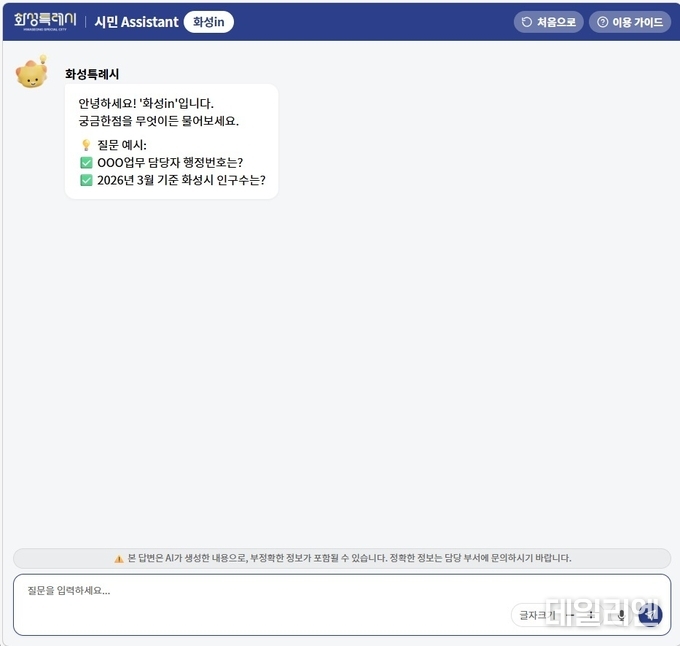 [데일리엔뉴스 유석주 기자] 화성특례시가 ChatGPT 기반 대화형 AI 검색 서비스 ‘화성in’을 23일부터 정식 운영하며 시정 정보와 민원 자료를 한곳에서 찾을 수 있는 시민 체감형 행정서비스를 내놨다.
