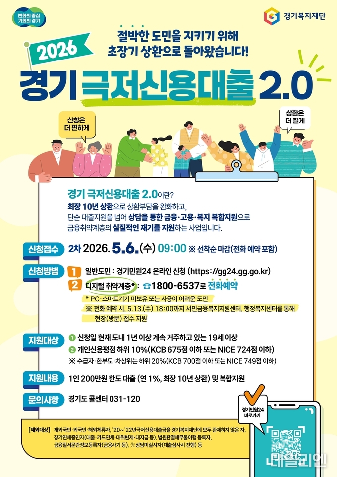 [데일리엔뉴스 이종성 기자] 경기도가 금융취약계층의 생활 안정을 돕기 위해 5월 6일 오전 9시부터 ‘경기 극저신용대출 2.0’ 2차 접수를 시작하고, 온라인 신청이 어려운 도민을 위해 전화 예약 접수를 병행한다.