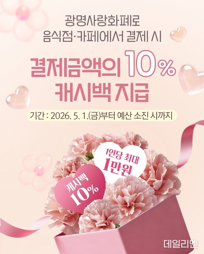 [데일리엔뉴스 이종성 기자] 광명시가 5월 한 달간 관내 음식점과 카페에서 광명사랑화폐로 결제한 시민에게 결제액의 10%를 돌려주는 캐시백 지원사업을 시행한다.